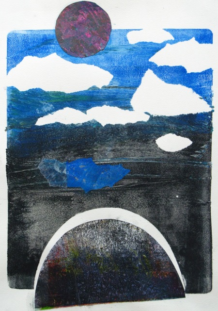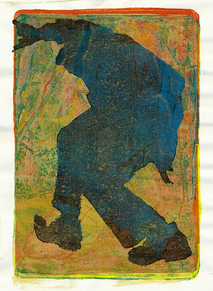 Gelli-plate print, block printing ink & collage on paper 8" x 12"