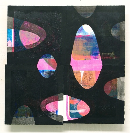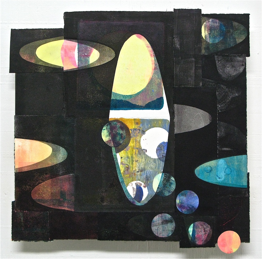 Gelliprint monoprint, collage, assemblage, acrylic on paper 15.125"x 15.125"