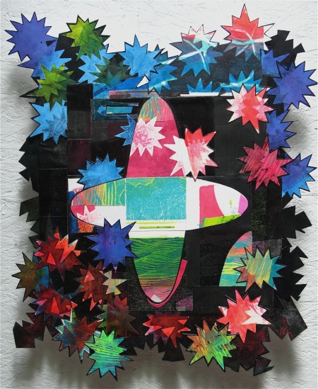 Gelliprint monoprint, collage, assemblage, acrylic on paper 15" x 17.5"