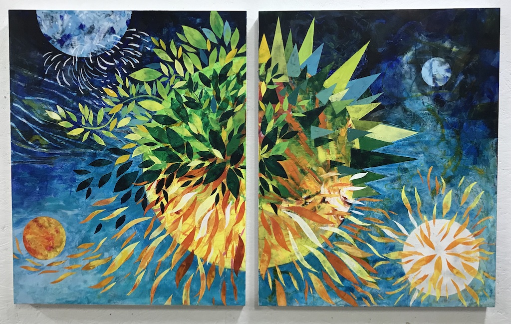 Oil & cold wax, acrylic ink, oil pastel, oil stick, oil paint, charcoal on cradled board (diptych) 27" x 54" (x2)
