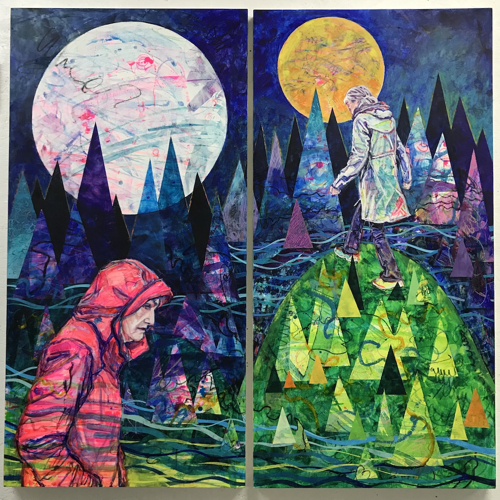 Oil & cold wax, acrylic, charcoal, oil pastel on cradled board, diptych 24" x 30" (x2)