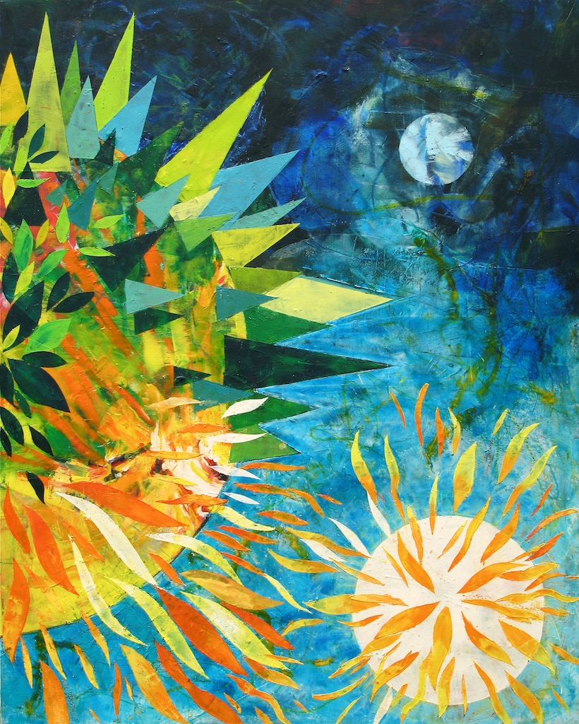 Oil & cold wax, collage, oil pastel, charcoal on illustration board 12" x 9"